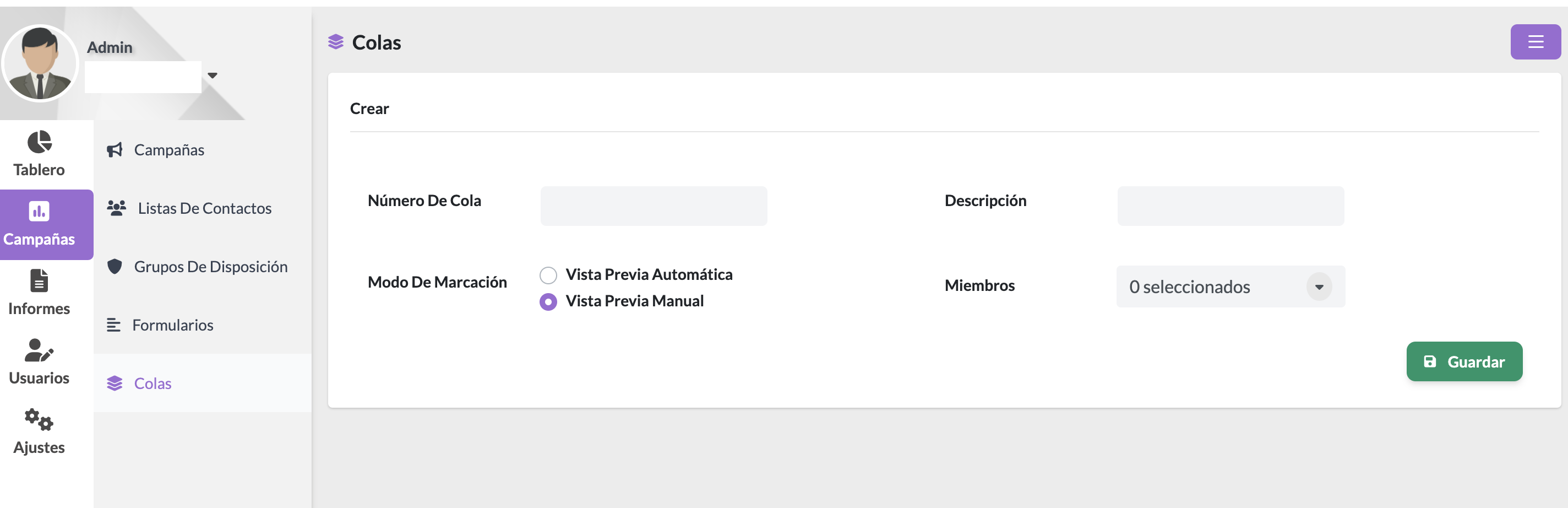 En muchas ocasiones el sistema es utilizado por varios departamentos de una empresa y no queremos que un área vea lo que hace la otra área. Aquí es donde configura a qué colas, agentes y campañas tendrá acceso el usuario administrativo.
