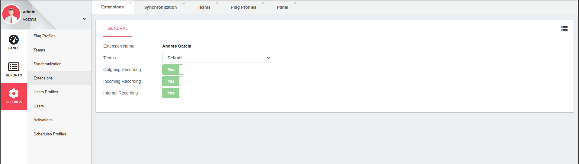 Es posible agrupar extensiones en equipos y cada equipo tendrá asociado un perfil de marca. Esto facilita enormemente la administración de grabaciones por departamento.