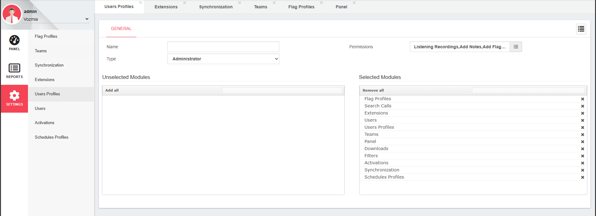 Recordings nos permite crear usuarios con diferentes tipos de privilegios, para crear los Perfiles de usuarios es necesario ir a Settings/User Profiles.
