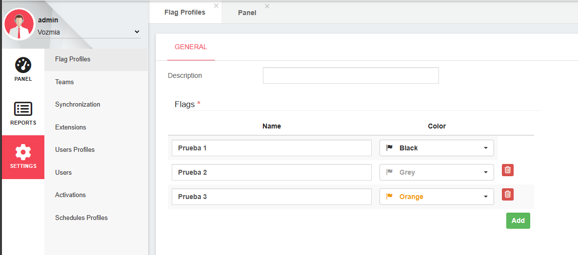 Es posible catalogar el tipo de llamada usando diferentes banderas de colores asociadas con diferentes textos. Estos nos permiten buscar llamadas por tipo de bandera, por ejemplo: Bandera Verde -> Venta, Bandera Roja -> Suporte, etc.